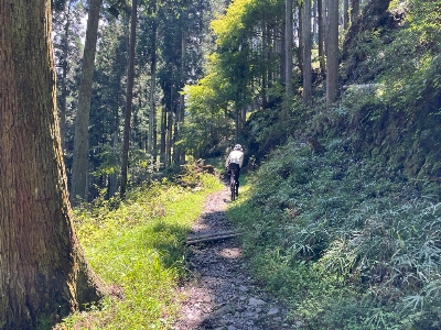 この方向で奥多摩湖に着くのか右往左往していると逆からむかし道を歩いて来たおじいさんに聞いてみるとこの道で合っているというので進んでみる。こうしているうちに後ろからグラベルE-バイクに乗った2人組の刺客が現れ・・・