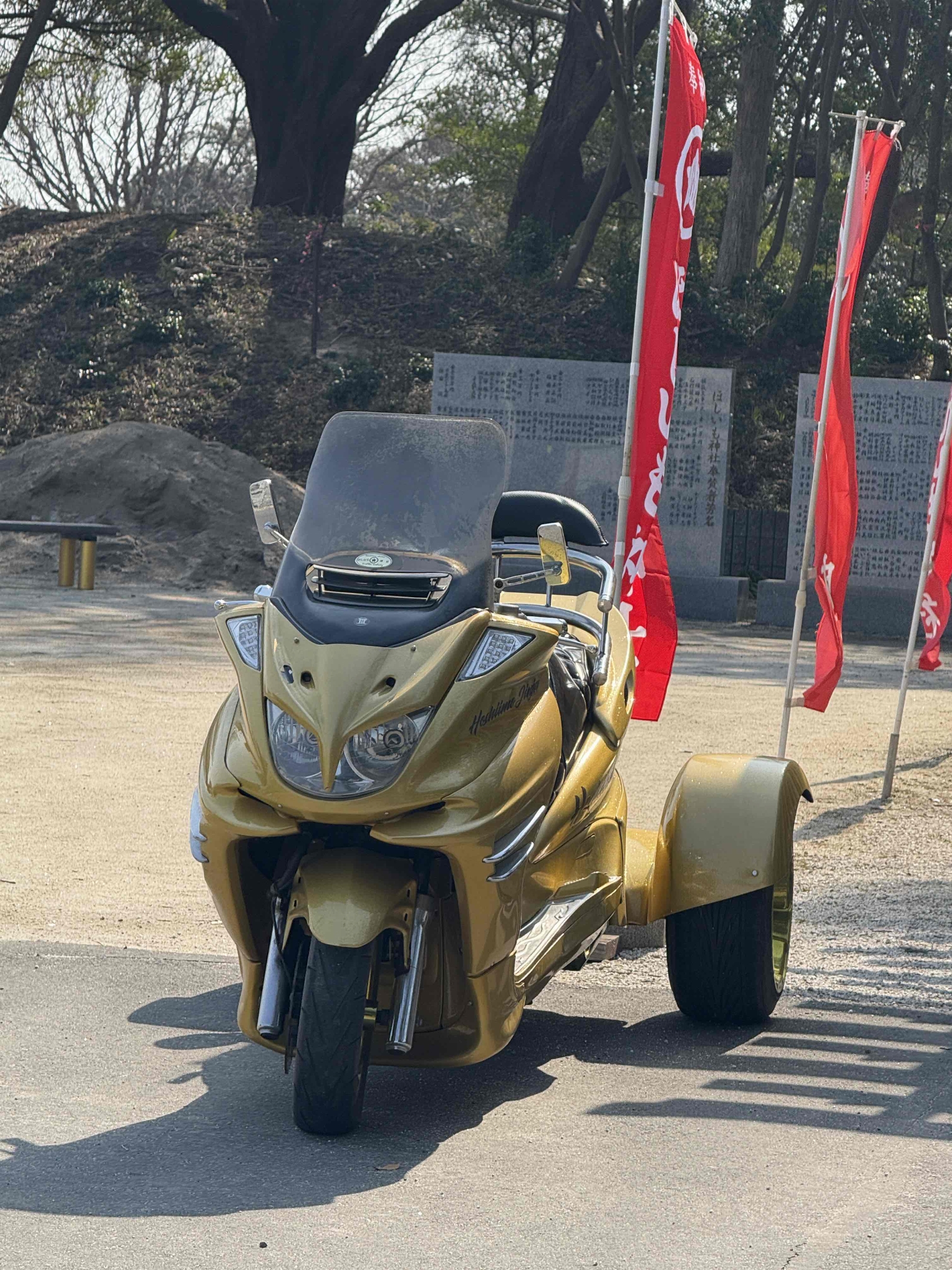 同じ敷地内に堀出神社があり、この神社は徳川光圀公が塚を掘ったところ御神体が出てきたことから出来た神社 ほしいも神社は、令和元年に日本一の干し芋作りを目指してもっとたくさんの人に知ってもらうために出来たまだ新しい神社 黄金の鳥居やバイクなどお参り以外も楽しめる