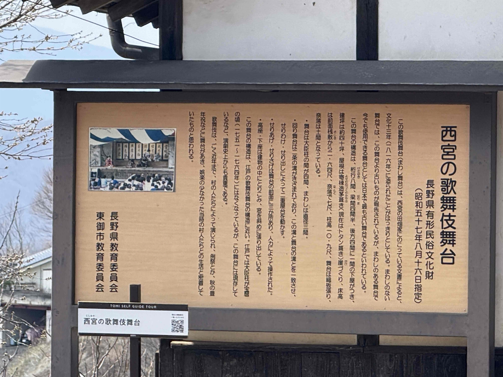 祢津地区には東と西にそれぞれ歌舞伎舞台があり、こちらにあるのは歌舞伎回り舞台としては最古のもので文化13年(1816)に出来たものでこちらにあるのは西の歌舞伎舞台 この歌舞伎舞台は回り舞台があるものとしては現存している中では最古の舞台だけど、いつもは戸を閉め切っているため行事がある時しか中を見ることができない