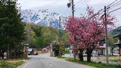 …かと思ったけど、標高400mの白川郷だって咲いている。 新緑なのに雪が盛りだくさんという、日本海側ならではの風景。
