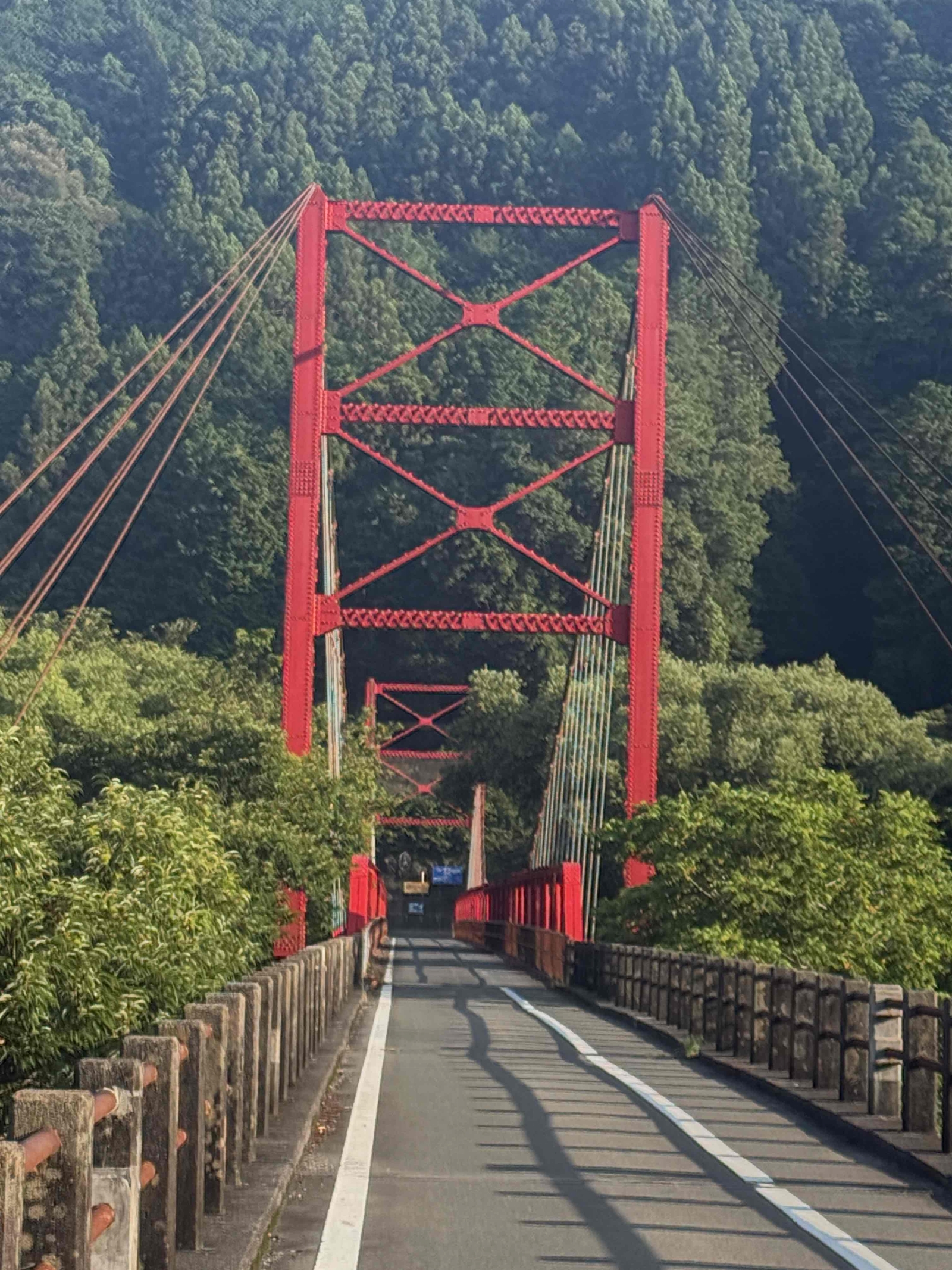 以前ネットで見た廃道区間と言われていた橋まで来てみたけど、普通に現役だった。車止めがあり、歩行者とバイク50c c以下は通行可能 橋の板が通るたびミシミシと音が鳴るので壊れないか心配になりながら無事走破! 橋から見る天竜川も綺麗で良かった! この橋、昭和46年にできたそうで、大井川の万世橋の架け替え工事の際に出た廃材の一部を貰い受けて、秋葉橋の架け替え工事をしたそう