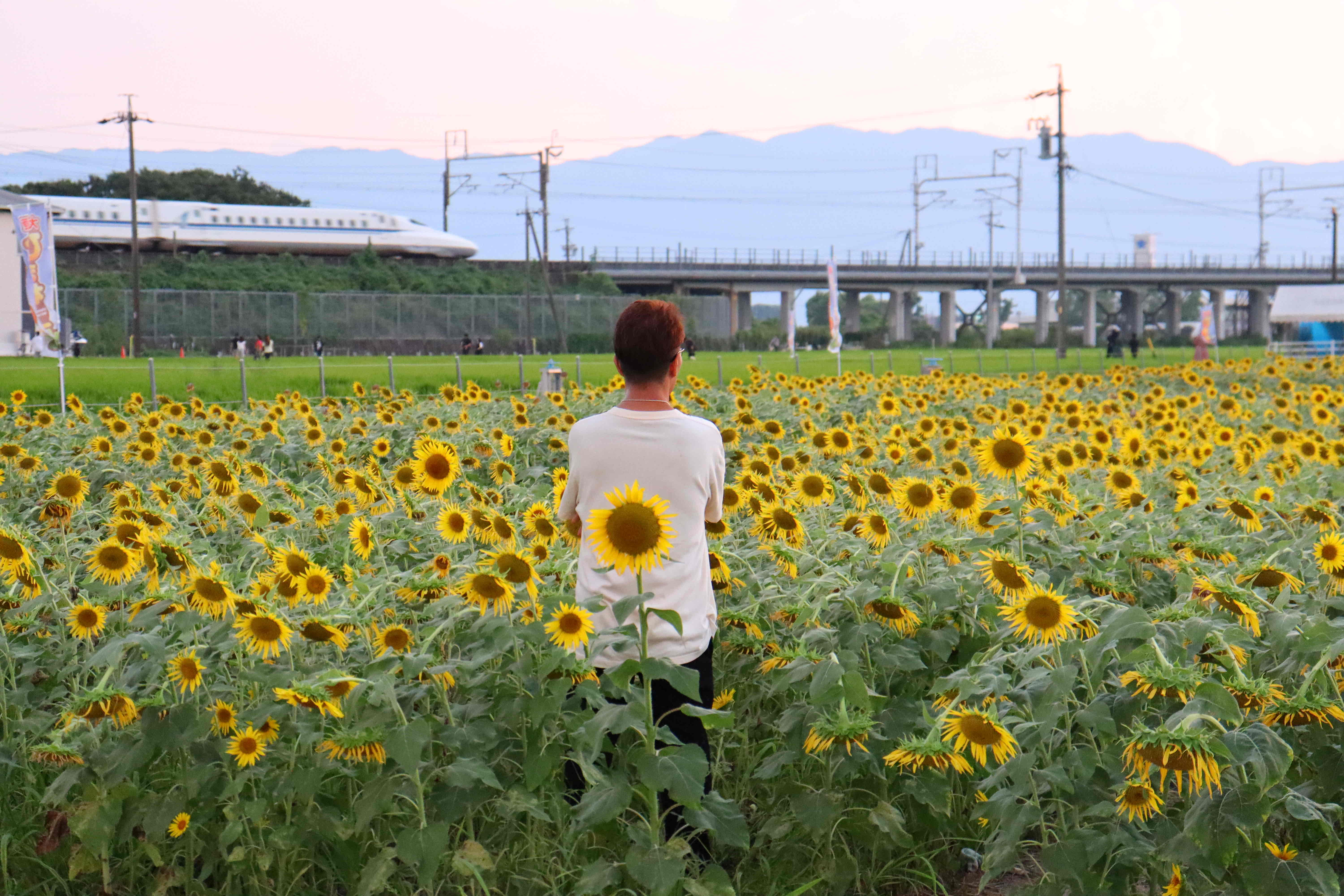 新幹線とひまわりが一緒に見れるどこにでもある笑ひまわり畑😏 ドクターイエローが引退する前にひまわりと写真撮らなきゃなぁ