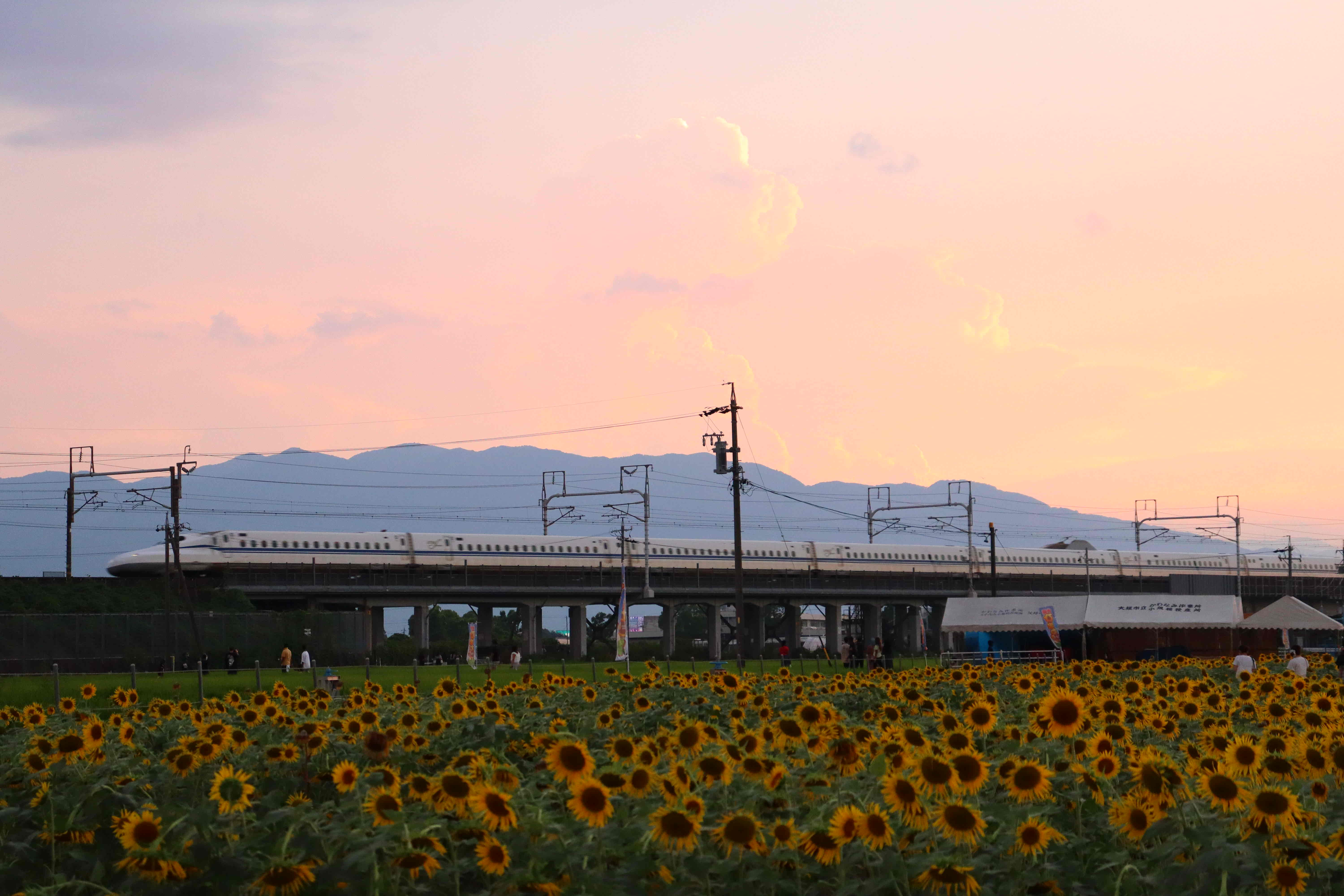 新幹線とひまわりが一緒に見れるどこにでもある笑ひまわり畑😏 ドクターイエローが引退する前にひまわりと写真撮らなきゃなぁ