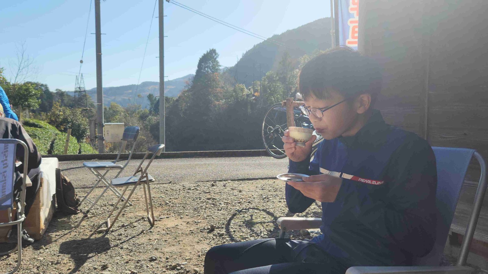 「森のあかおに」で昼食を摂りました。「赤おにご飯」、「青おにピザ」と「赤おにピザ」をご用意頂き、ポカポカ暖かい沿道で設置して頂いたテーブルとイスで暫く日向ぼっこ。