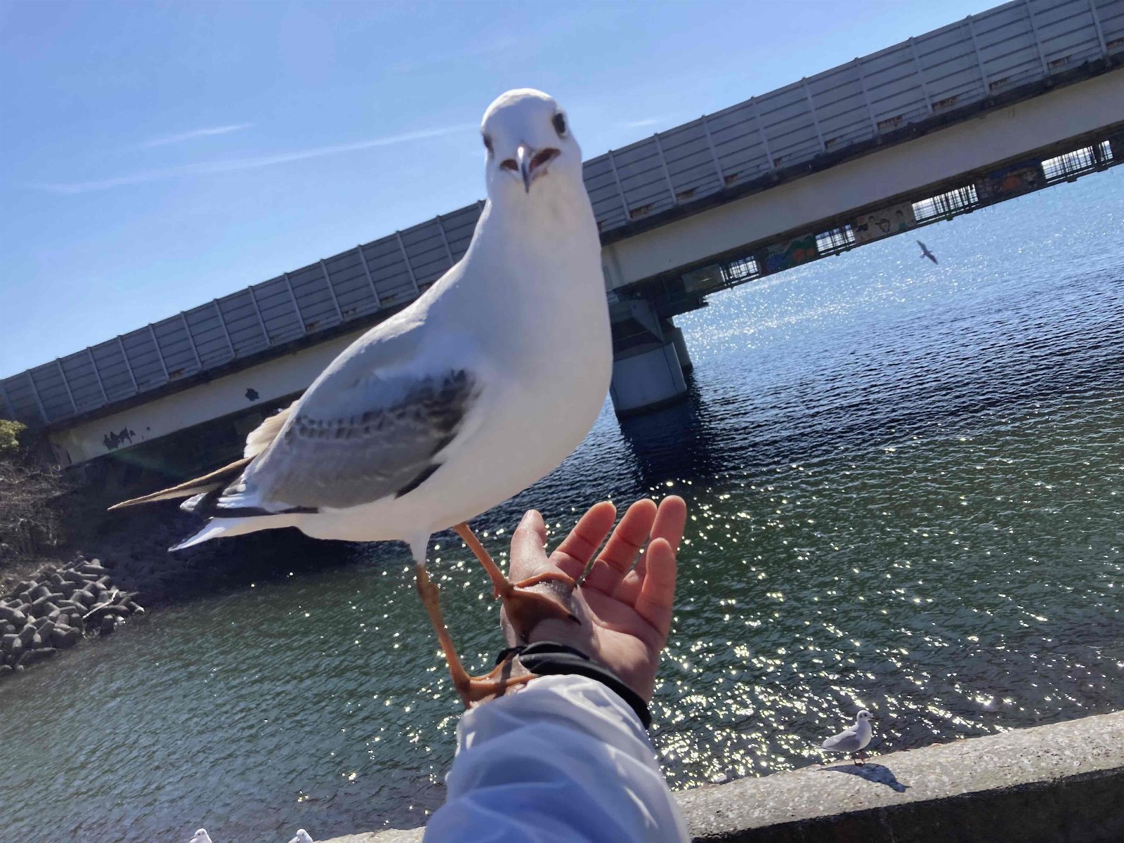 浜名湖佐久米駅 ゆりかもめ減ってきたかな?暖かい日も増えたしね☺️ 前日パン屋で買ったパン耳を持ってきた! 今年も手に乗ってくれた 可愛すぎる♡長居してしまった