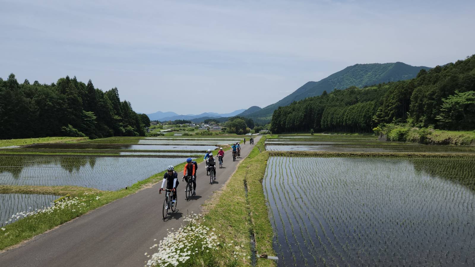 早速登場する今日のもっともキツイ登り区間を終えると、半野地区の高原に到達します。緩い斜面に一面の田んぼが広がっている中、最高地点まで緩やかに登っていきます。