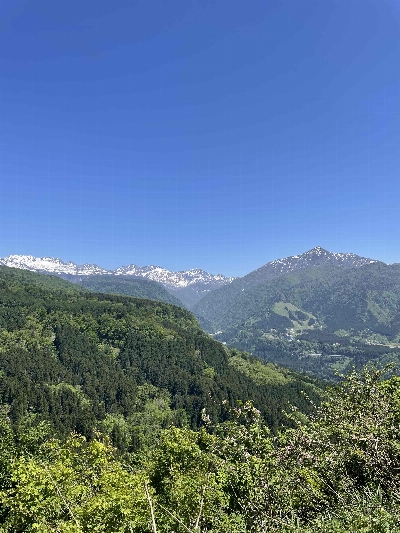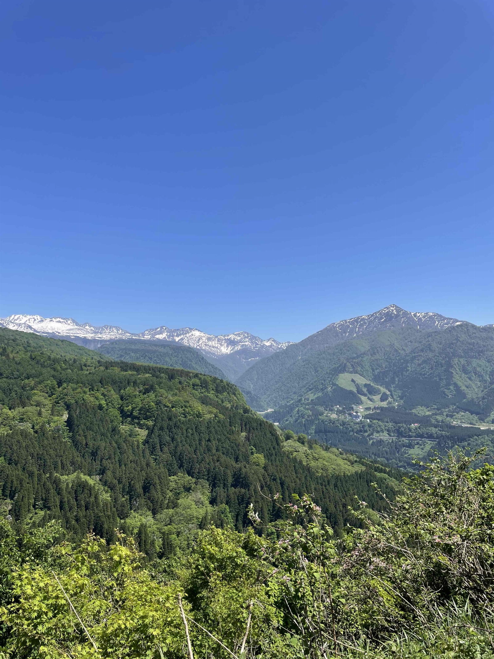 ライオンズの森から少し進むと大辻山林道に出ます。左折し進むと右手に富山湾が望める城前峠に出ます。峠の反対側に進むと案内板があり、目の前に立山連峰、常願寺川の谷を挟んで立山山麓リゾートエリアが一望できる絶景スポットです。
