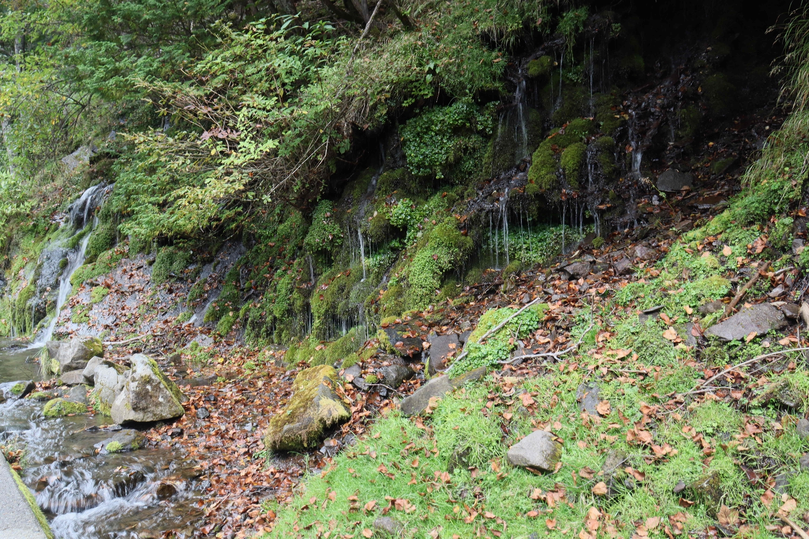 冬に凍るとされる湧水。 この周辺は道路沿いでもきれいな苔がたくさん茂っており、もののけの雰囲気が感じられる笑