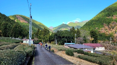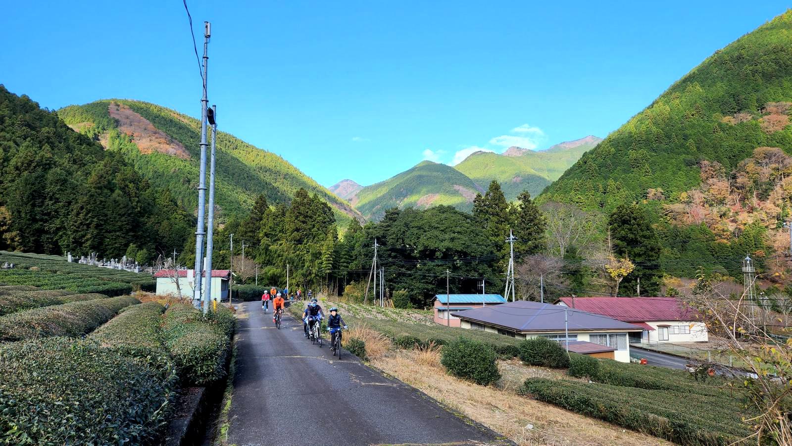 富士山の絶景スポットで一旦休憩し、温かいお茶とコーヒーや補給食等を楽しんでから、天子山地の更なる山奥へと進んでいく。暫くすると、紅葉している森の隙間から水色の水面が輝く天子湖が現れ、そしてその果てには視界が開き、いよいよ佐野集落に到着。