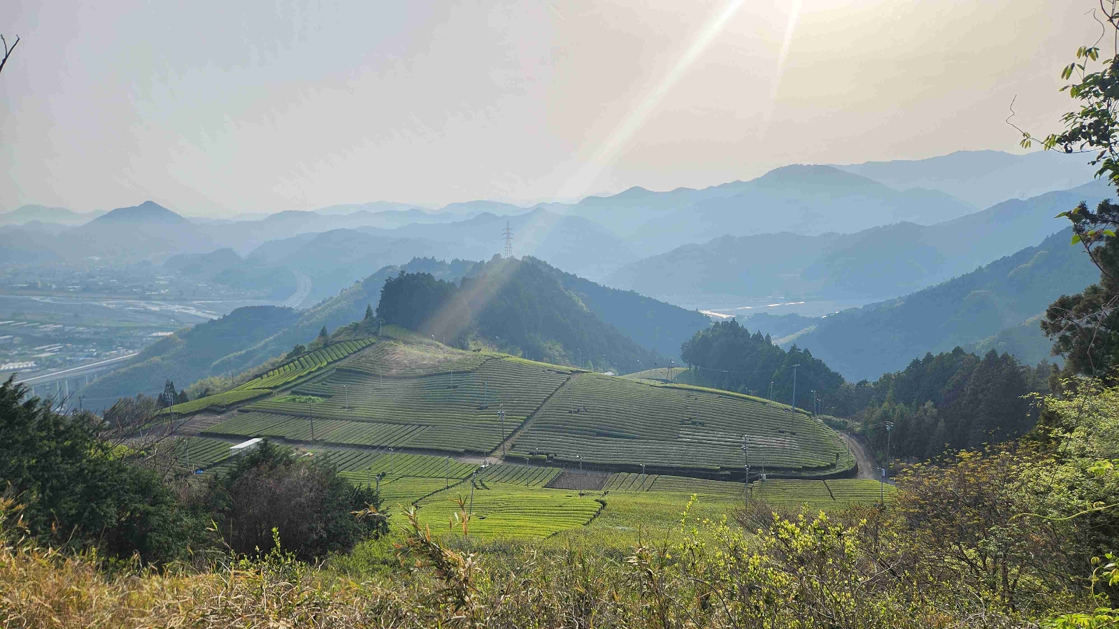 静岡市街と安倍川を一望できるような高台にまとまった感じの茶畑がある。林道に入って少し登った所で最高の絶景に出会える。