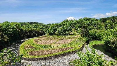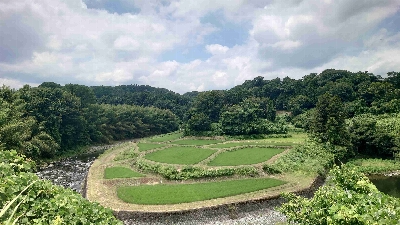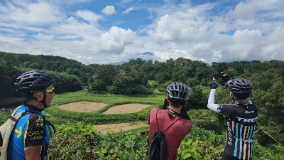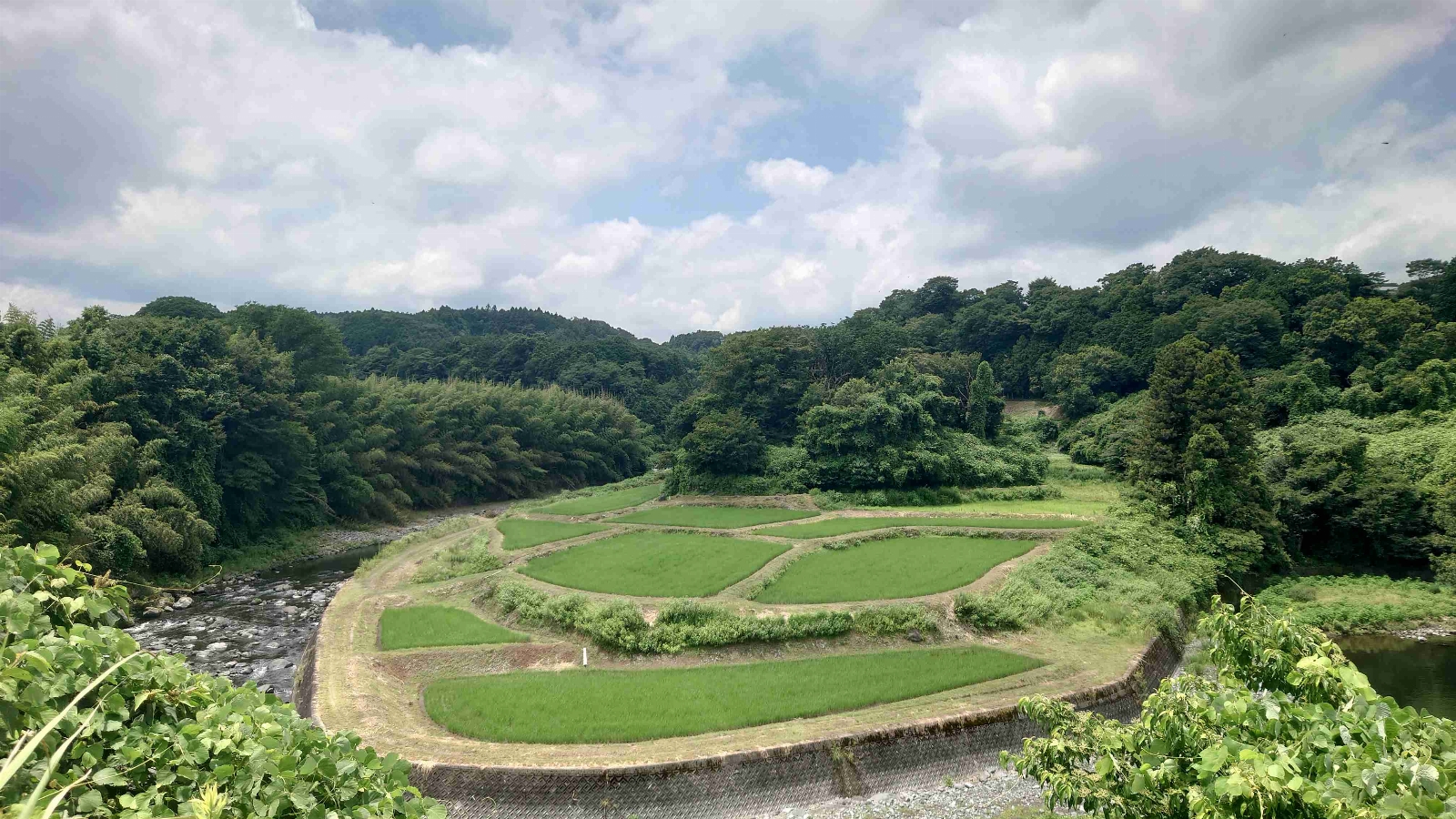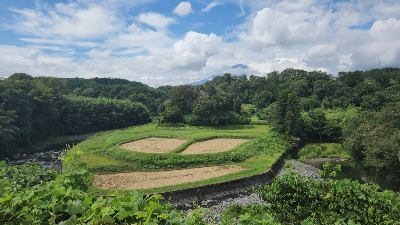 川の蛇行の中に閉じ込められている小さな棚田。何よりも。富士山の雄大な姿がその真上に現れる。反対側の田んぼの中を少し行く農道を奥まで進むとたどり着くと展望台に辿り着く。