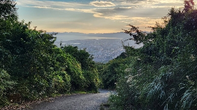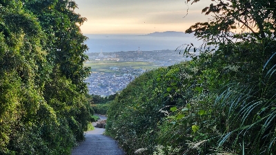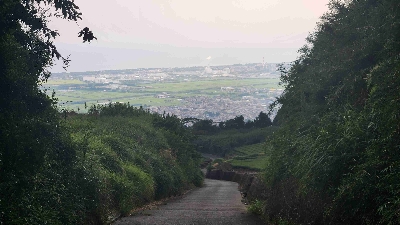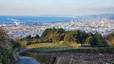 愛鷹山に向かう壁のような農道から見える海と町の絶景。