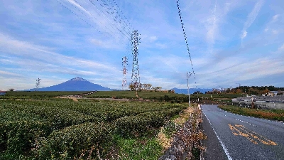 富士山と茶畑の共演が楽しめるスポットのひとつ。新茶の季節は茶畑が眩しいほどの黄緑に染まる。