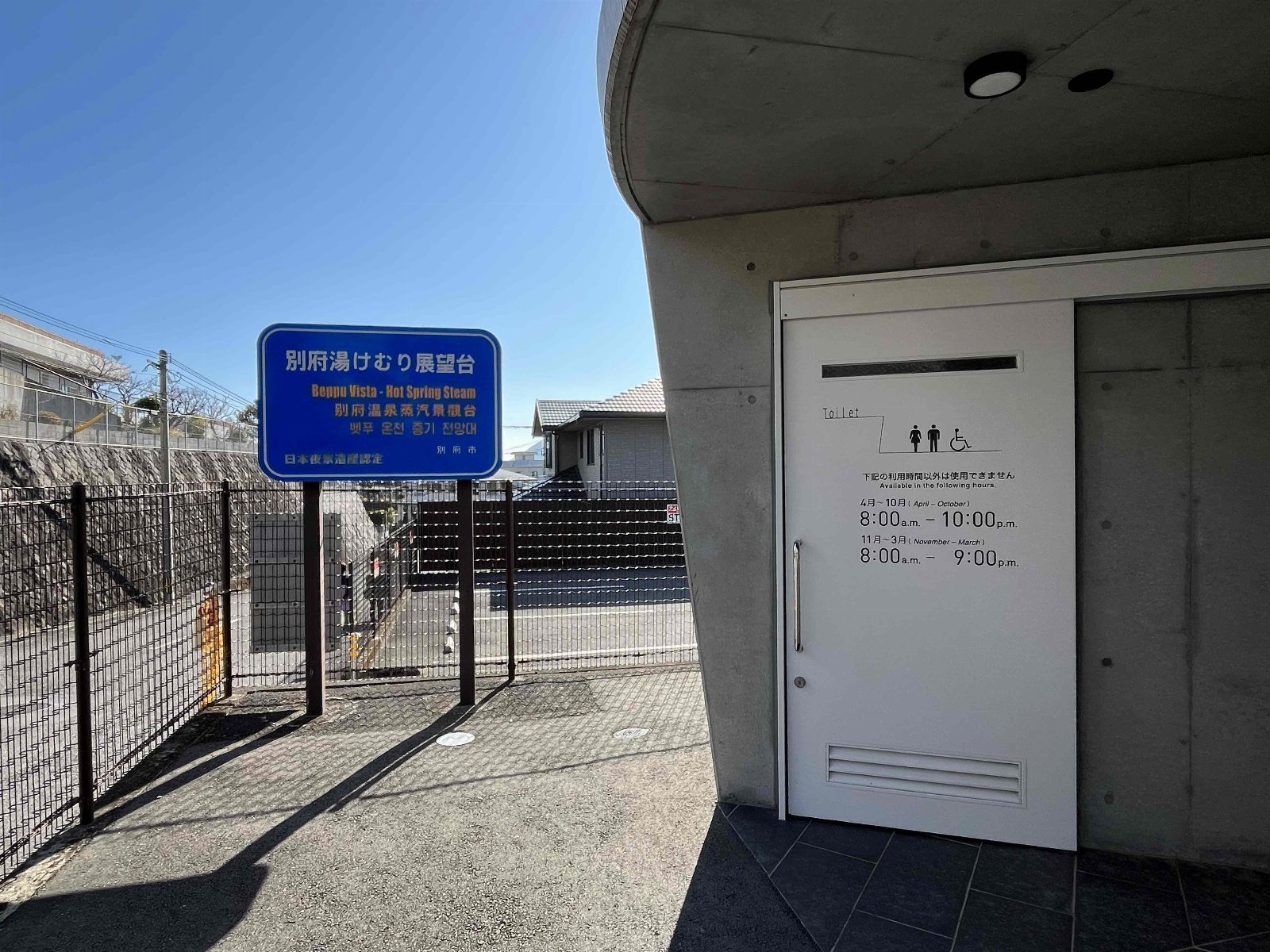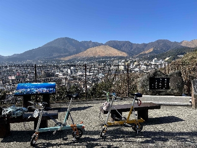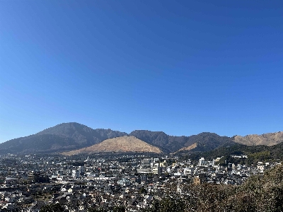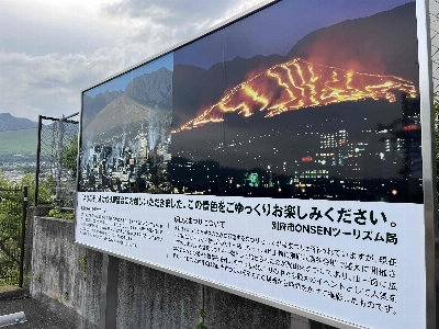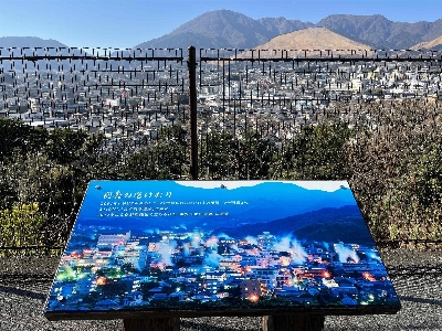 タイミングが良ければ鉄輪温泉、明礬温泉をメインに街の様々な場所から立ち昇る湯けむりが見られる。奥には扇山で毎年行われる火まつりのあとがはっきりと見て取れる。横には鶴見岳が鎮座しており一度見れば忘れる事のない絶景となる。