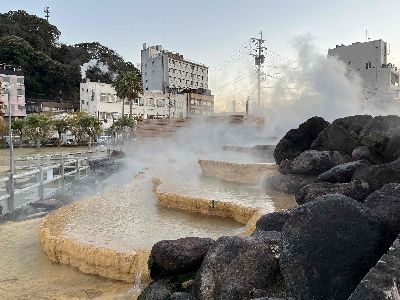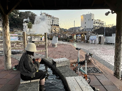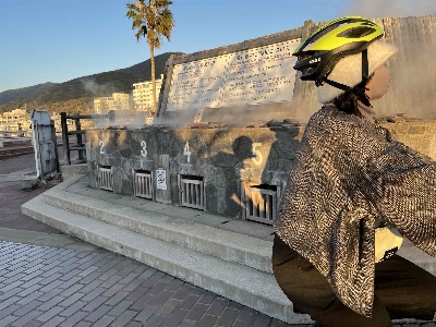 デッカい橘湾と西彼杵半島に沈んでいく夕日を見ながらの足湯は至福のひととき。