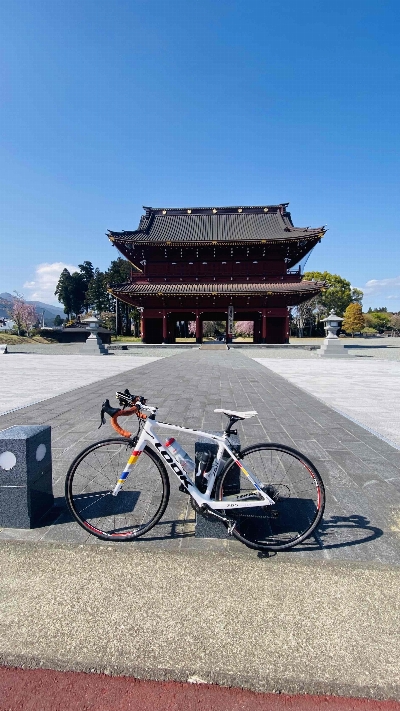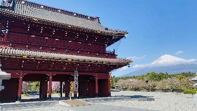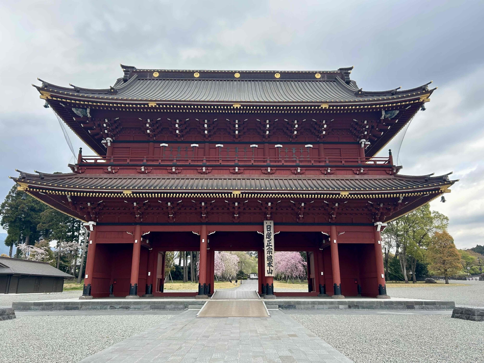 沿道に建っている大きな門。この向こうにある大石寺を外周から回ることができる。桜が多いエリアで、富士山も綺麗に見える。