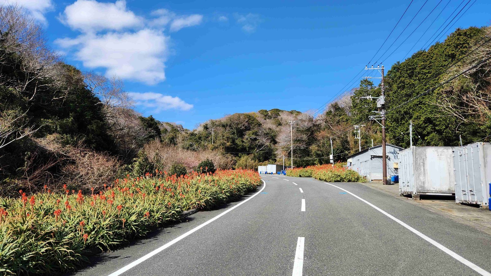 冬に赤い花が咲くアロエがたくさん映えている場所(工場の敷地内?)を道路が通り抜いていく。