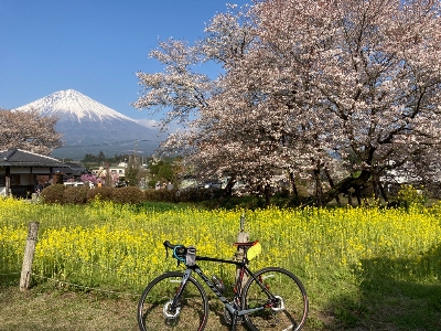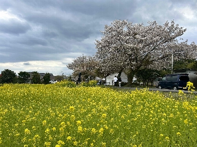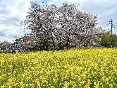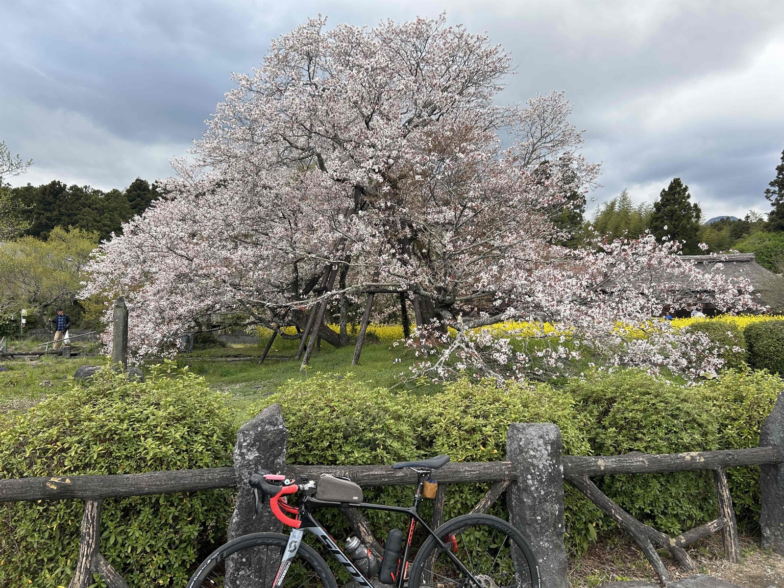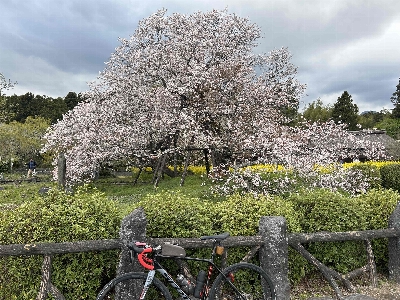 大きな菜の花畑の中に、特別天然記念物とされている日本五大桜。1193年源頼朝が巻き狩りに来て馬を繋いだと言われる桜で、特別に大きいわけではないが、歴史が感じられる。