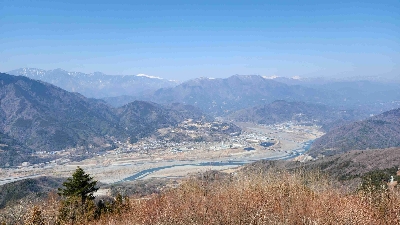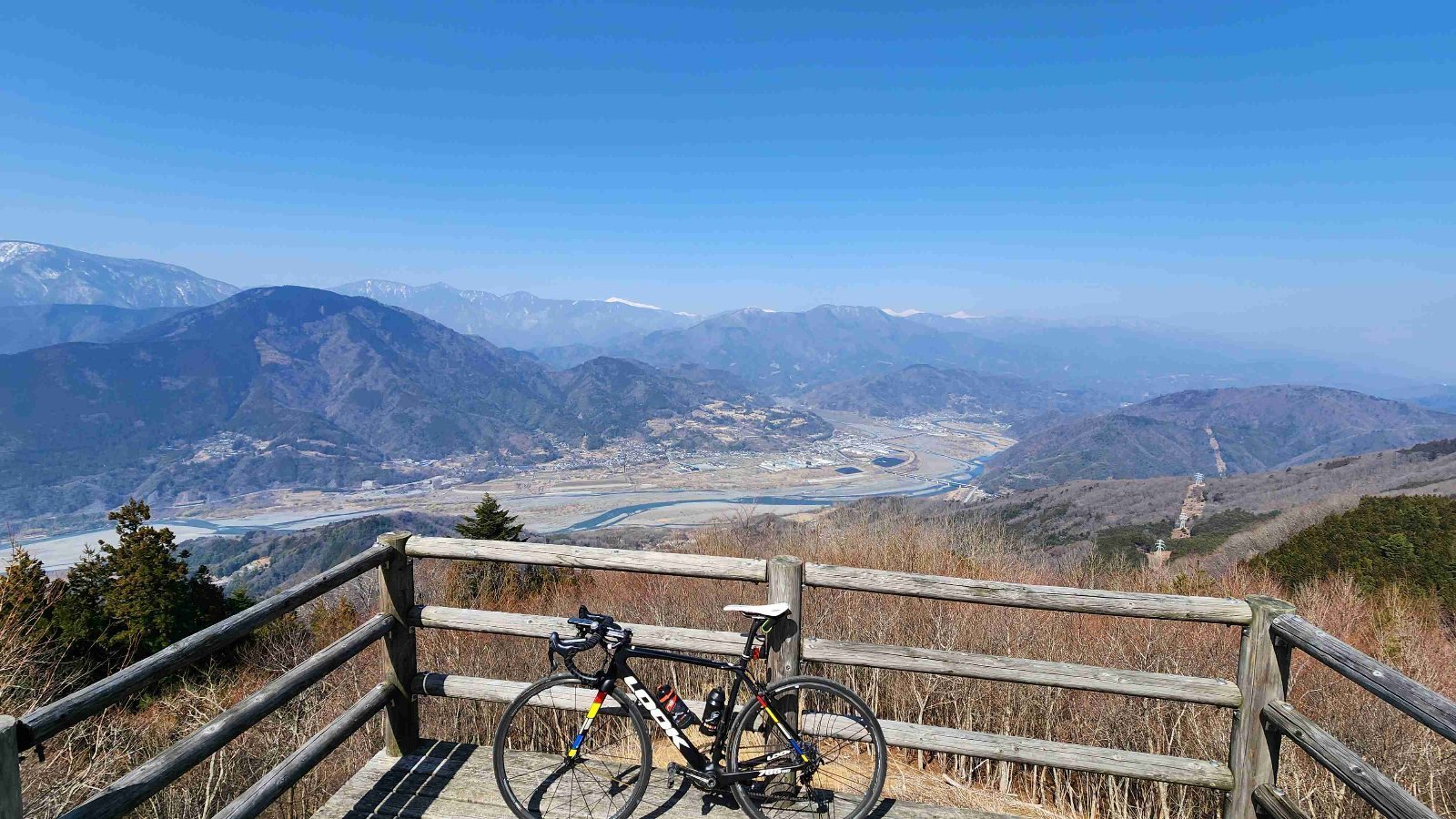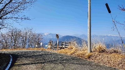 林道三石山線の最北部の峠の頂上にある展望台。空気が済んでいる時は八ヶ岳までハッキリ見える。ここまで来たら、あとは下部への下りだけ(南下する方は地獄の始まり)。