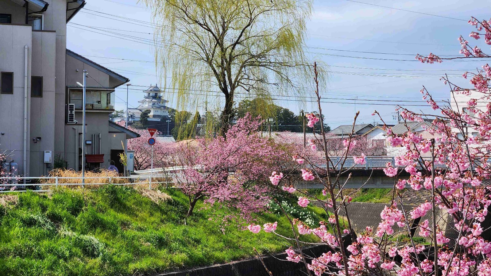ソメイヨシノより早く満開を迎える掛川桜。咲く時期が早いのも、色の濃さも、確かに寒緋桜系らしい。川沿いで1.5kmほど続いている。