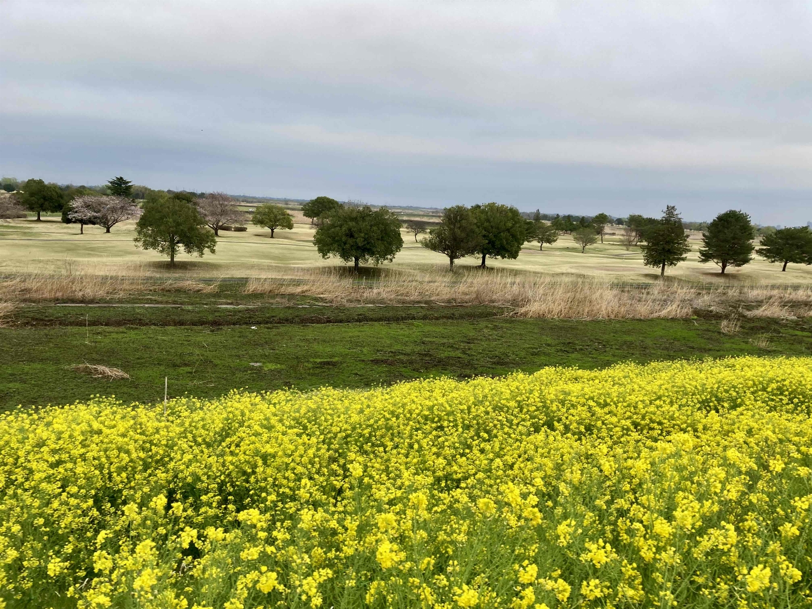 堤防の自転車歩行者道沿いを菜の花が覆っている。