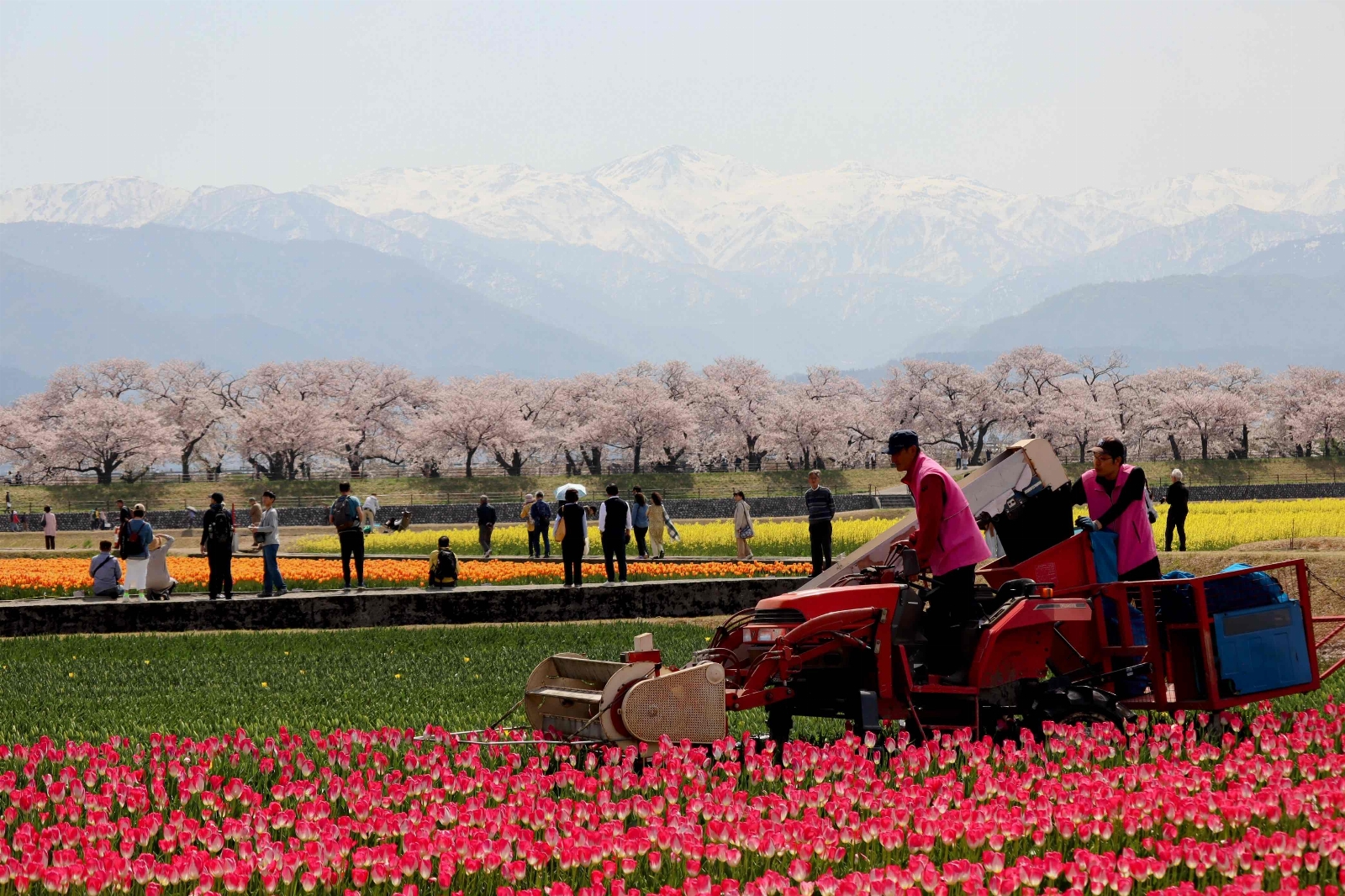 残雪の北アルプスを背景に桜並木🌸、菜の花、チューリップ🌷が奏でる「春の四重奏」