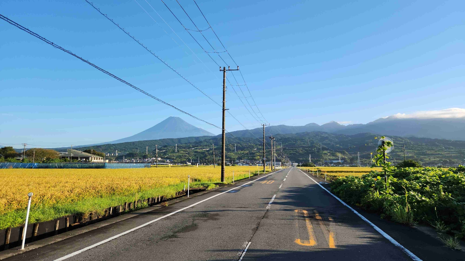 富士山と愛鷹山に向かって、田んぼの中を突っ切る美しい直線。田んぼが綺麗な夏は一番美しいが、富士山が一番良く見えるのは冬。6月以降の晴れの日の早朝がオススメ。