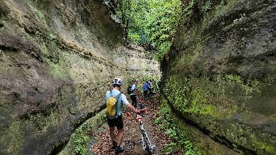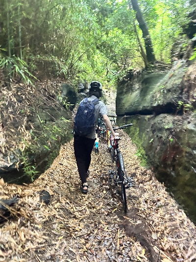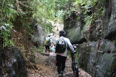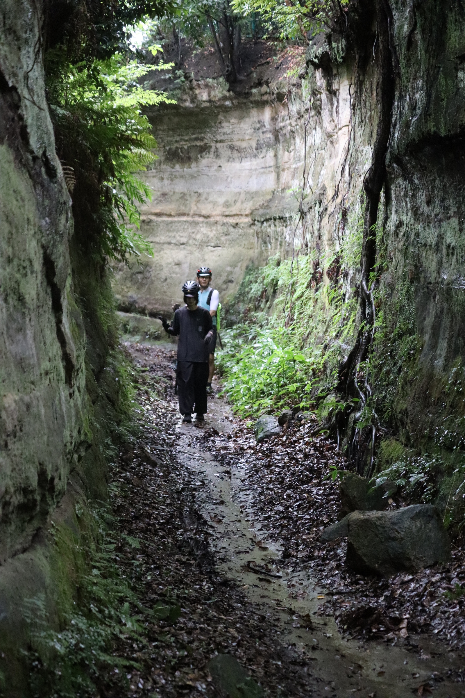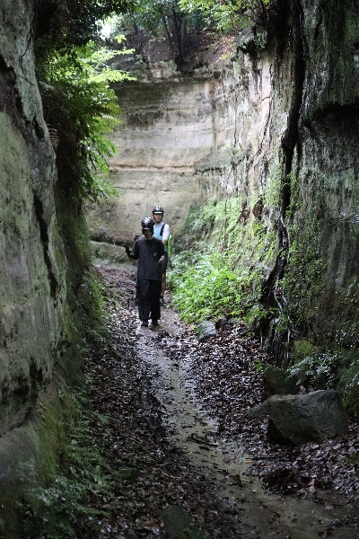 二つの住宅街を結びつける大きな切り通し。なんともない住宅街のなんともない行き止まりが、異世界への入り口。両サイドの壁の高さは三人分以上!押し歩きなら、通り抜けることができる。