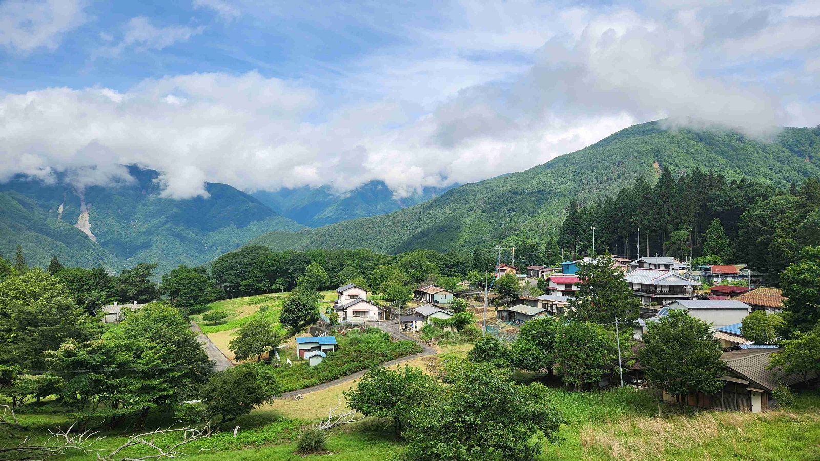 雄大な南アルプスの中腹に位置する集落。周辺に伸びる様々な林道は定期的に崩壊しているので、アクセスは悪いが、四季折々に変わる集落と山々の眺めは別格。
