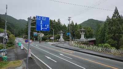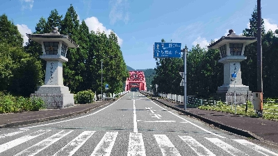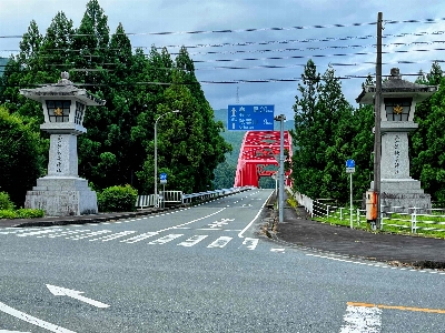 秋葉山本宮秋葉神社に向かう「天竜スーバー林道」の入り口を囲む大きな関門。赤色が目立つ雲名橋がそのちょうど真ん中で、迫力満載。