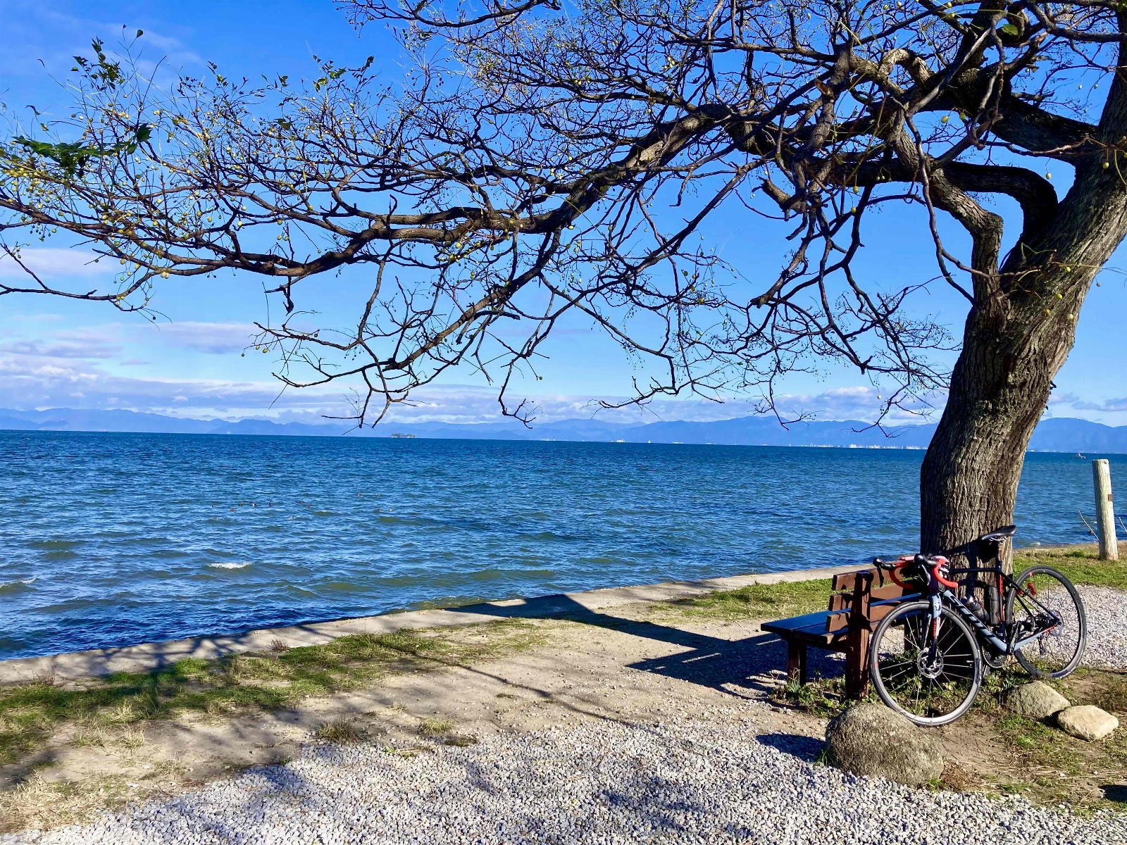 湖岸を走っていると、見つけられるベンチ。