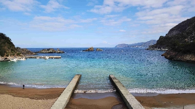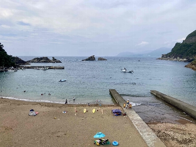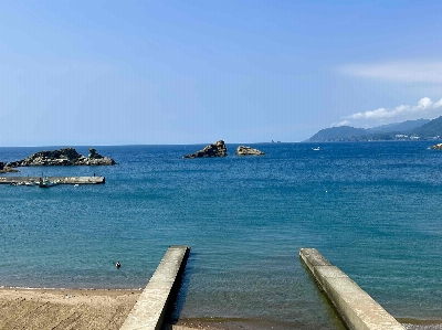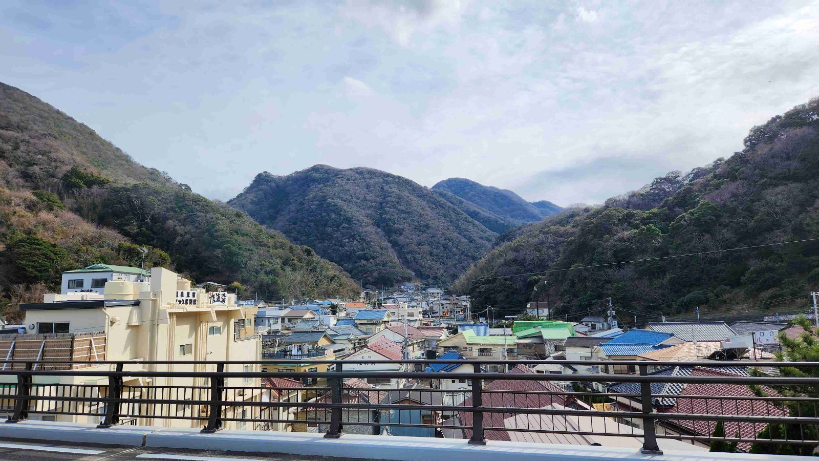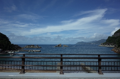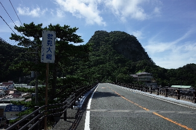 浅間宮がある特徴的な丸い山と、珍しい町にかかる橋がある港町。