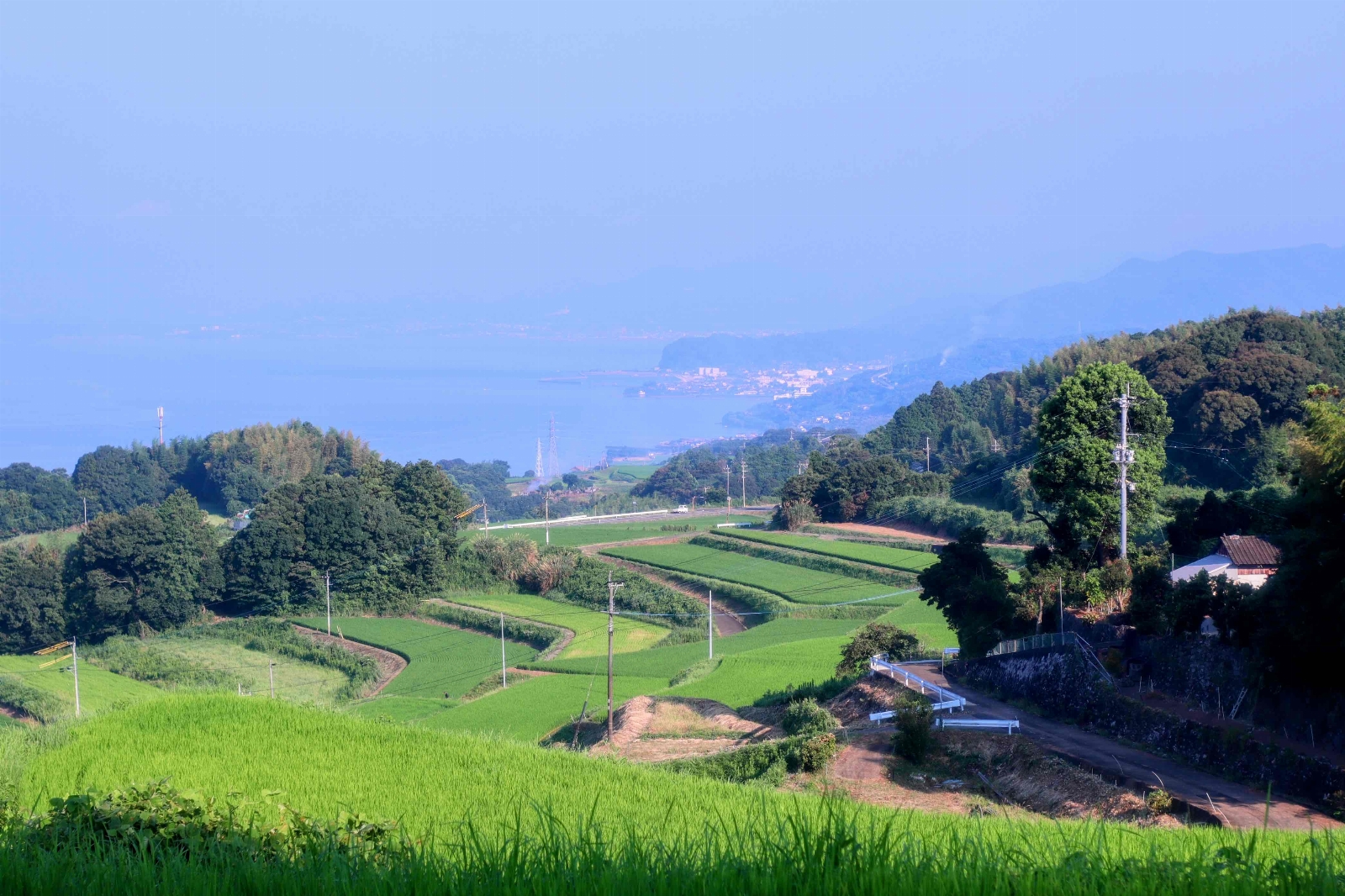 新緑の田んぼと大村湾の青のコントラストが良き良き。