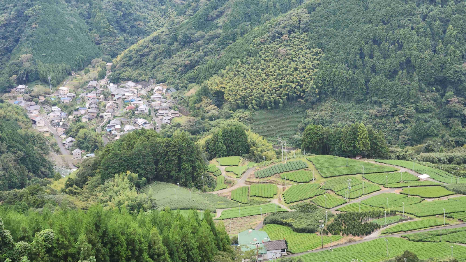 竜爪地域の美しい天空の茶畑。平山集落を見下ろす高台に位置している。また、静岡市外から10kmも離れていないにもかかわらず、味わい深い山深さが印象的。