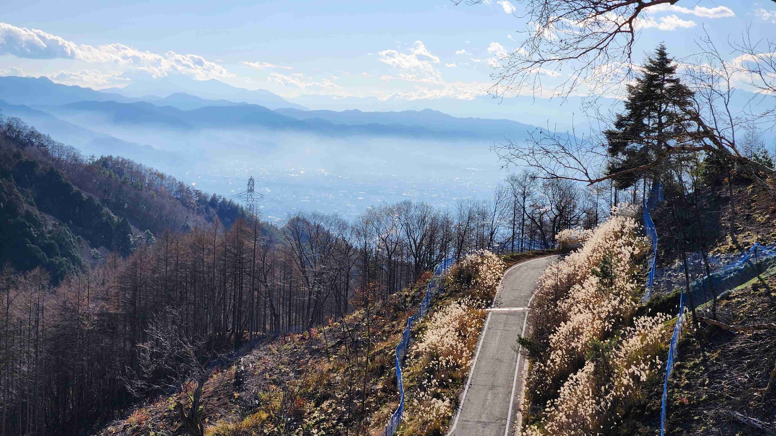 1500mを越える位置からの眺め。九十九折が続く林道を全体的に見渡せて、甲府盆地の市街まで一望できる。