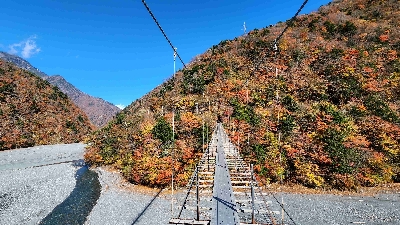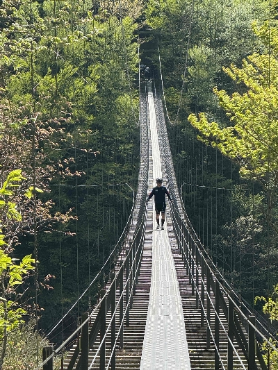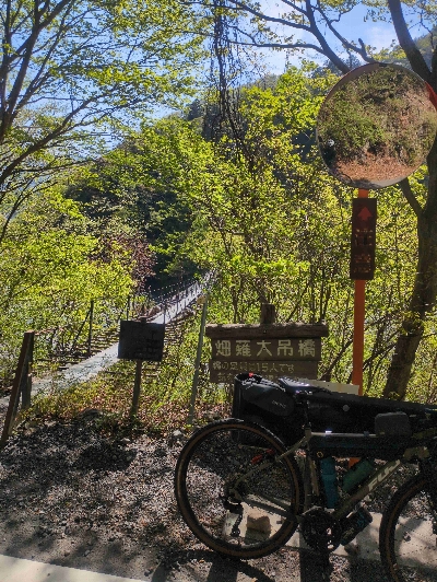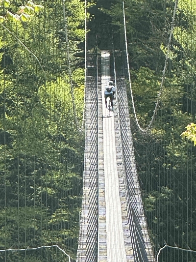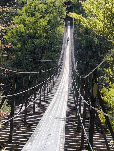 夢の吊り橋に負けない、美しい吊り橋。平沼ゲートの先にあるので、車でアクセスすることはできず、自転車か徒歩のみなので、利用するのは一週間に数回の登山客ぐらい。その割には、とても綺麗に手入れされている。