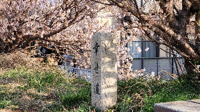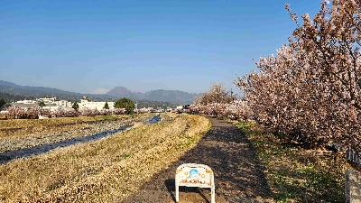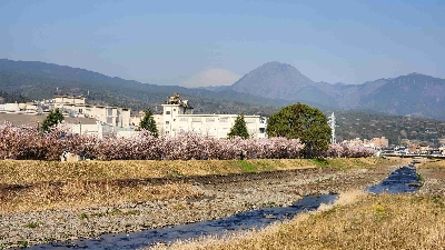 3月中旬にソメイヨシノより一段落早く咲く春めき桜の並木で賑わう遊歩道。晴れの日には富士山も頭だけ見える。