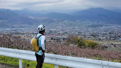 甲府盆地を背景に笛吹の桃源郷を一望できる絶景。4月上旬~中旬頃に桃の花まつりが開催される。