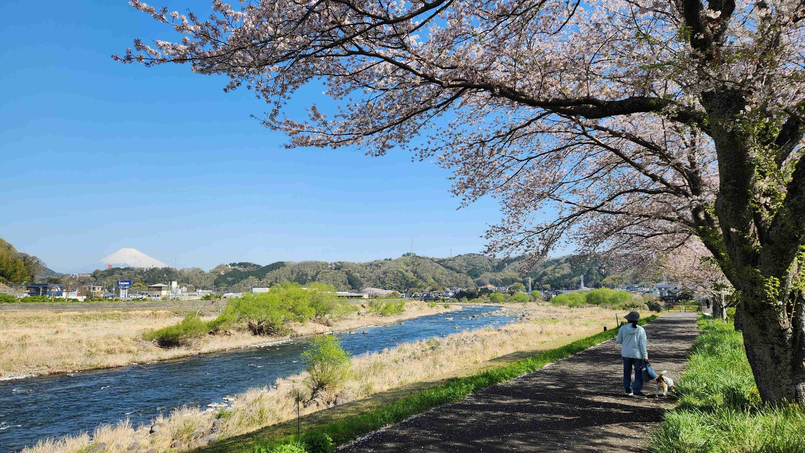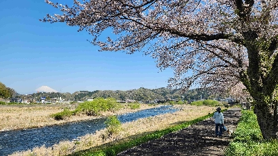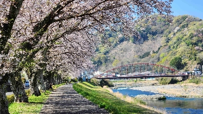 狩野川沿いに続く500mの桜並木。様々な花が植えられていたり、周辺にも多くの桜が視界に入ったりしており、そして修善寺橋との相性も良い。