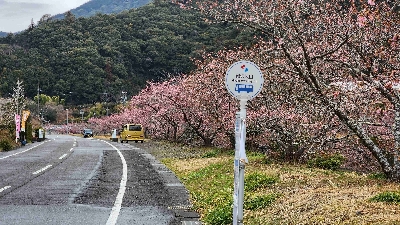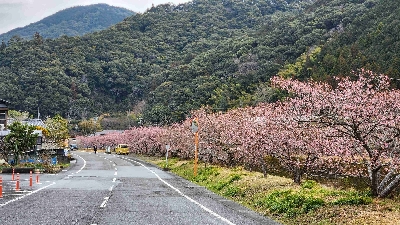 2月中旬から咲き誇る河津桜の並木。