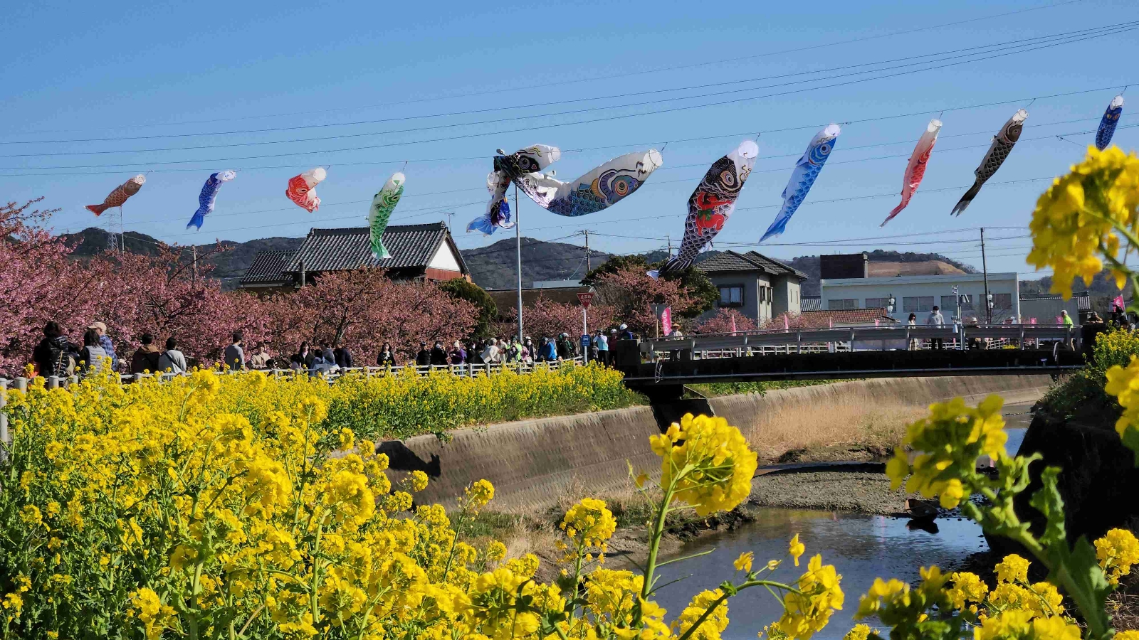 2月中旬頃から3月中旬頃の間に、早い春の訪れを満喫できる菜の花と河津桜の共演が楽しめる。