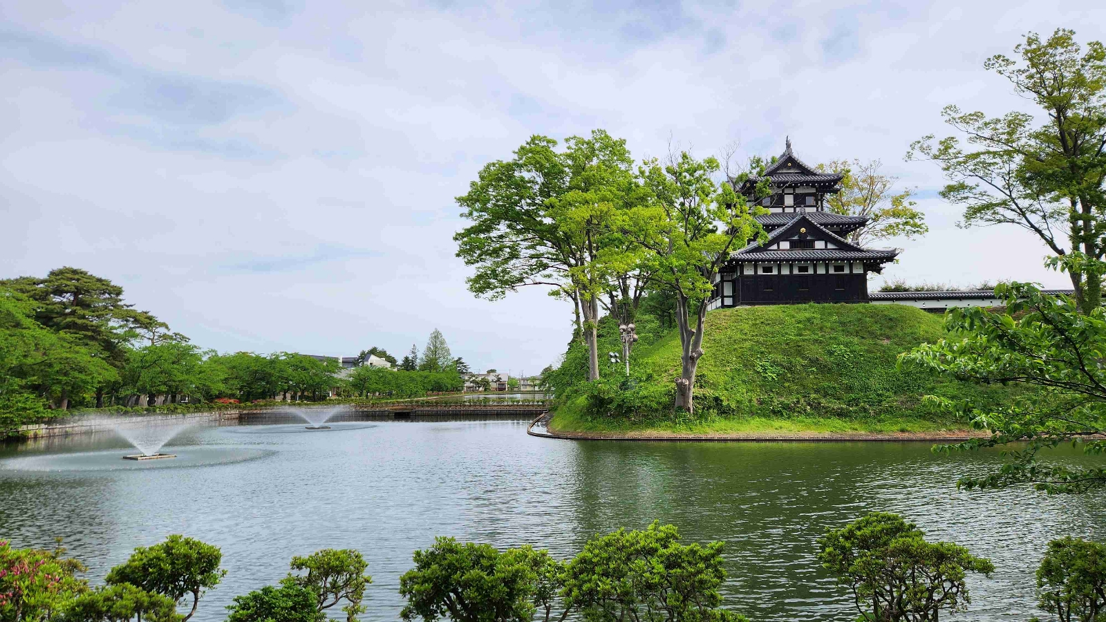 かつて高田城があった場所。今では、復元された三重櫓と、立派な堀だけとなっているが、かつての城の規模感が良く伝わる。