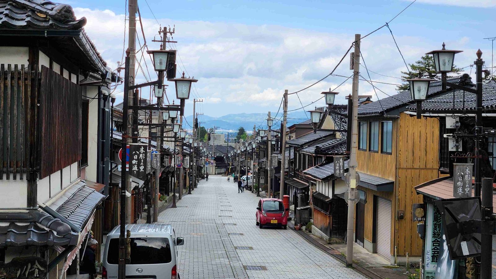 大きな門に向かう八日町通りもレトロ感たっぷりでいつまでもフラフラしていたい。