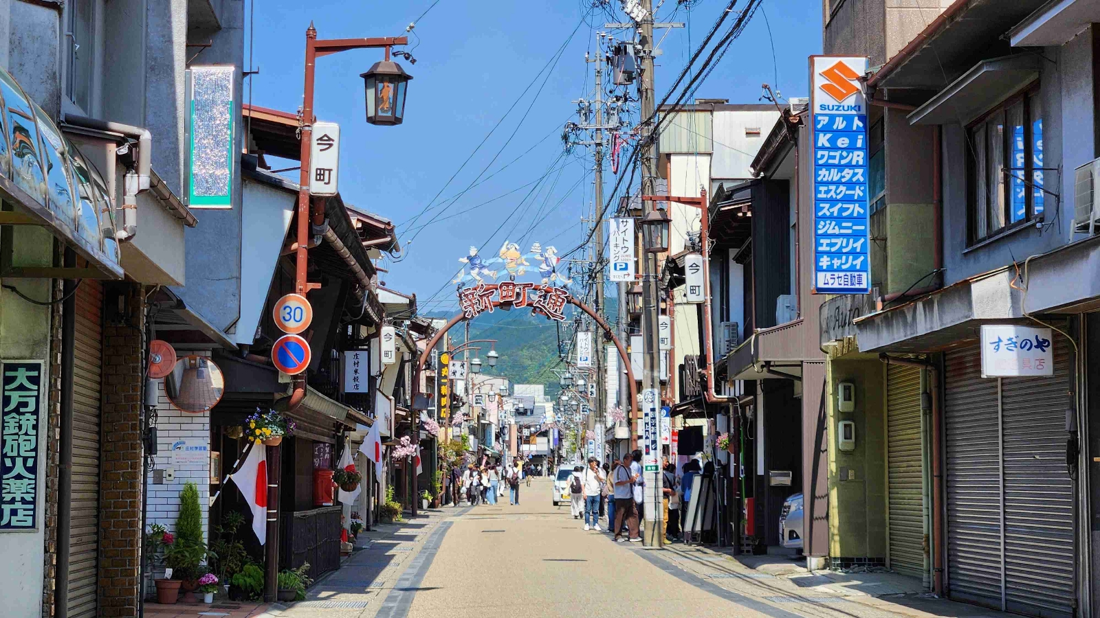 様々な城下町の街並みが存在する八幡町の「昭和版」の商店街。どこの道をぶらり歩いても気持ちがいい。