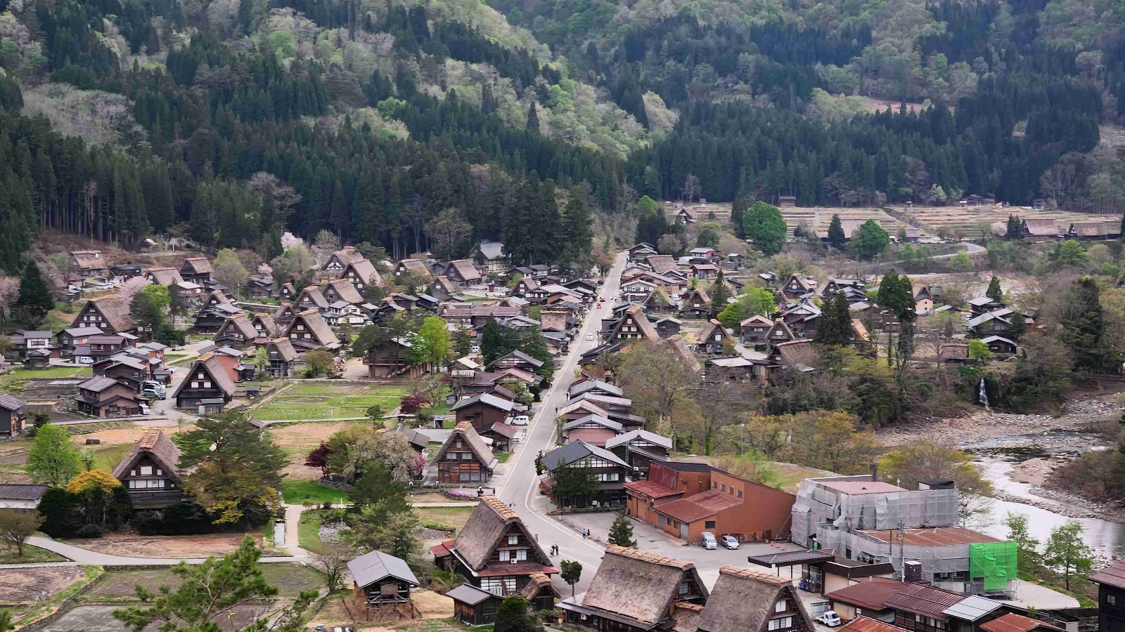白川郷を全体的に見下ろせる展望台。白山を背景に、伝統的な茅葺き屋根の農家を眺めることができる。