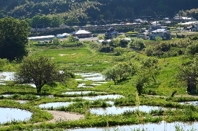 「せんがまちの棚田」といい、お茶の整地のど真ん中に広がる美しい棚田風景。東海道線が麓を通っている。