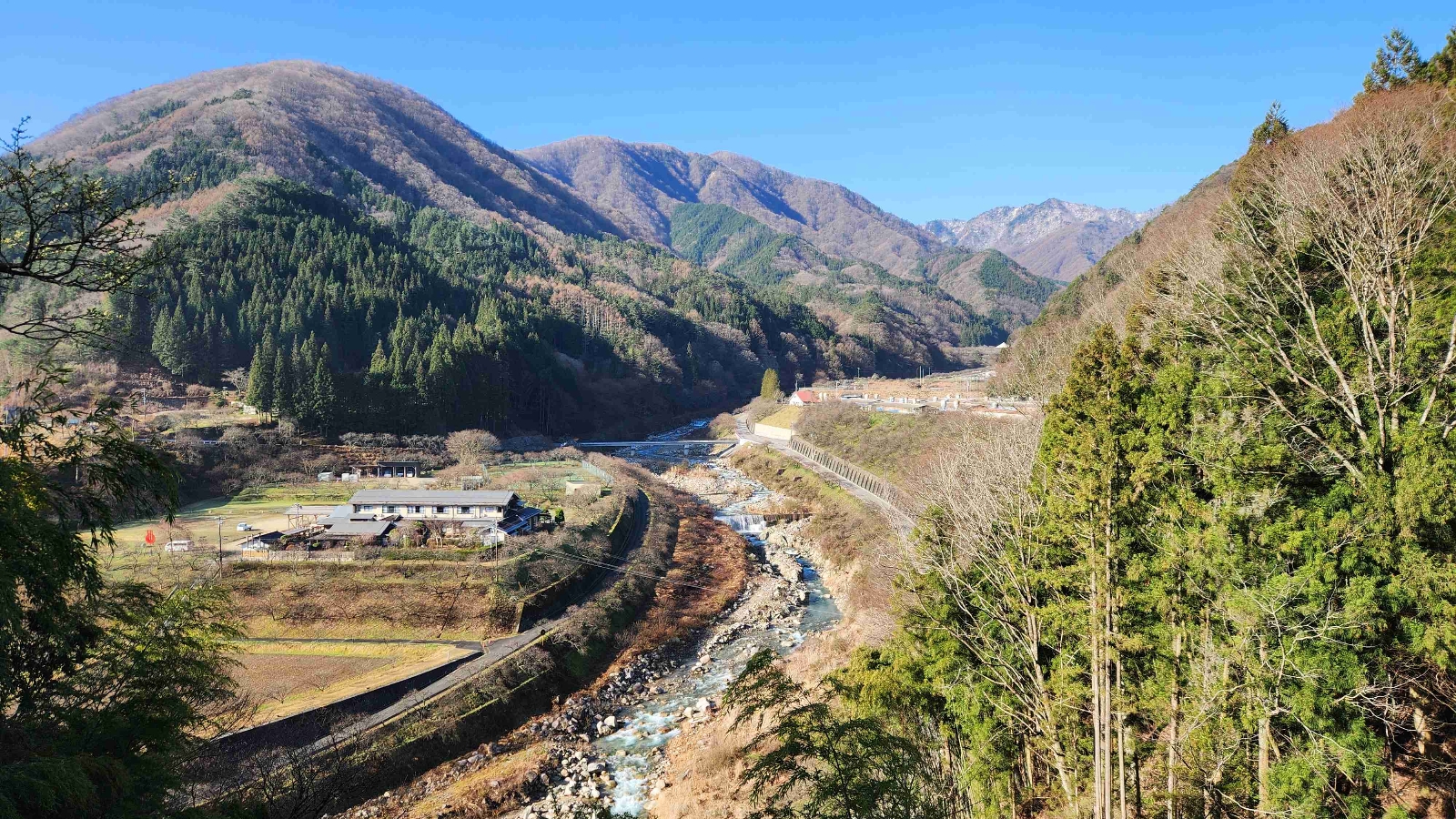 日本一の花桃の里を一望できる展望台。見頃は5月上旬頃。時期になると、一面のピンク、赤と白に咲く花桃で視界がいっぱいになる。