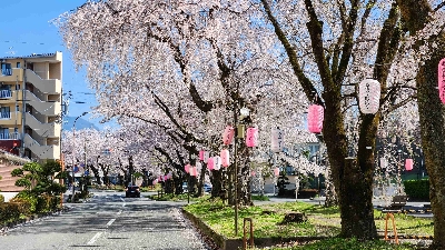 飯田市の花見スポットのひとつ。大宮諏訪神社に向かう4車線の道路の真ん中に桜の並木が続いている。