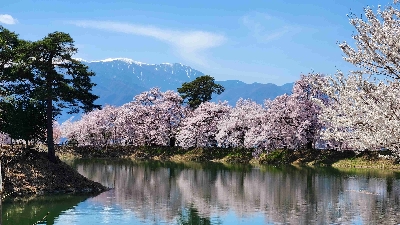 農業用水の溜池だが、春はフォトジェニックなスポットへ早変わり。水面に桜が映り、背景の中央アルプスが綺麗。