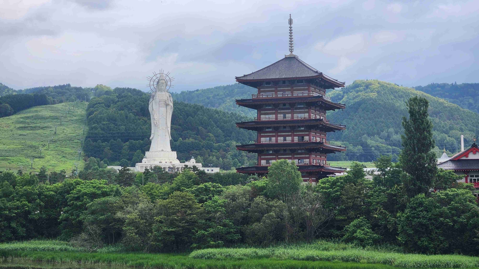 橋から見える謎の巨大な観音と五重塔は良くも悪くも芦別のシンボル的存在で、かつてバブル期の遊園地のアトラクションとして作られたところが宗教法人に買収され、立ち入ることができなくなった。